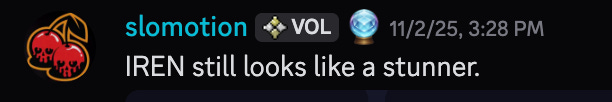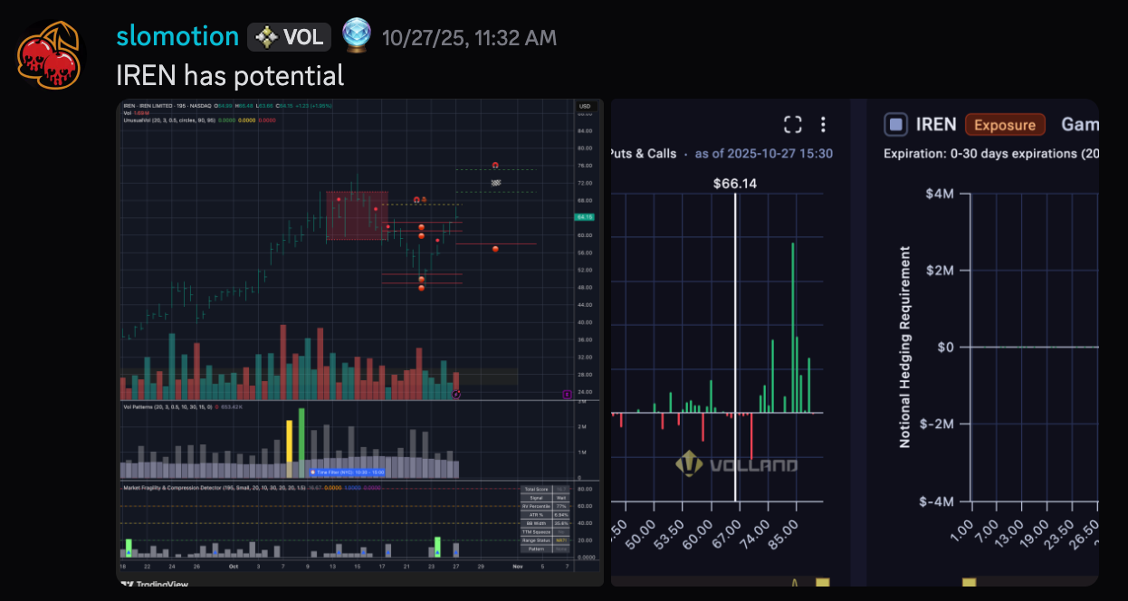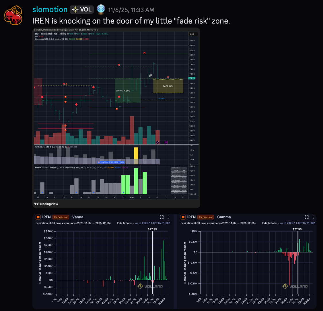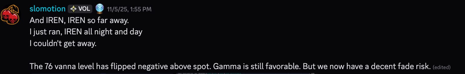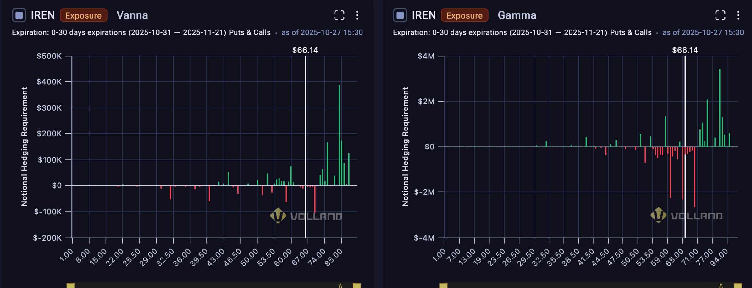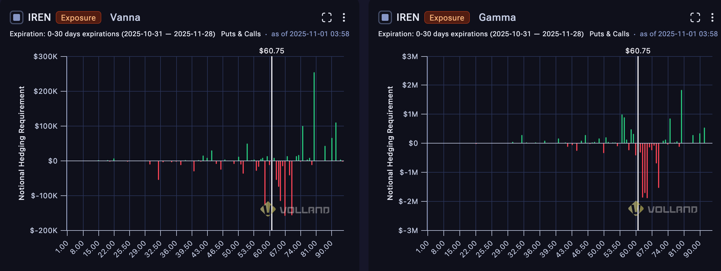 I liked the large new negative vanna below spot showing confluence with gamma support. I was optimistic but I was not prepared for what happened Monday November 3rd: IREN hit an intraday high of $75.73 which was a 24.7% increase from the previous session’s close!