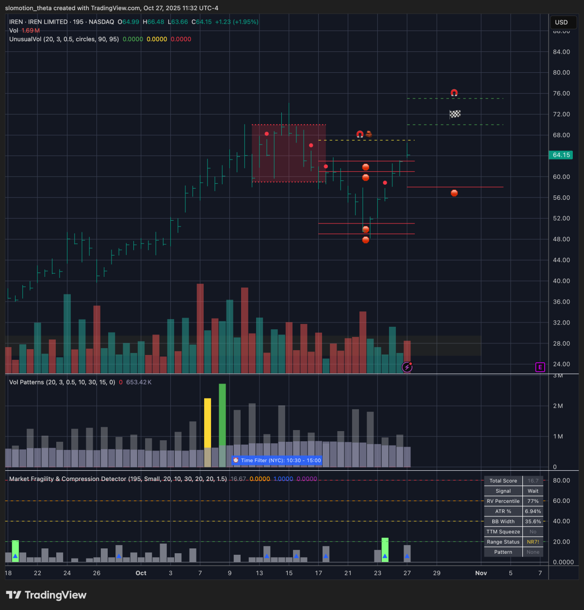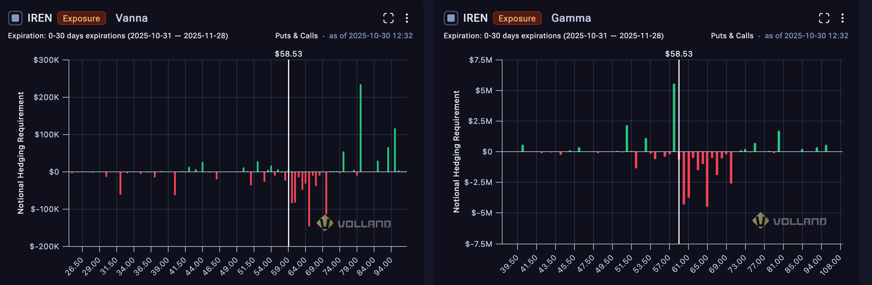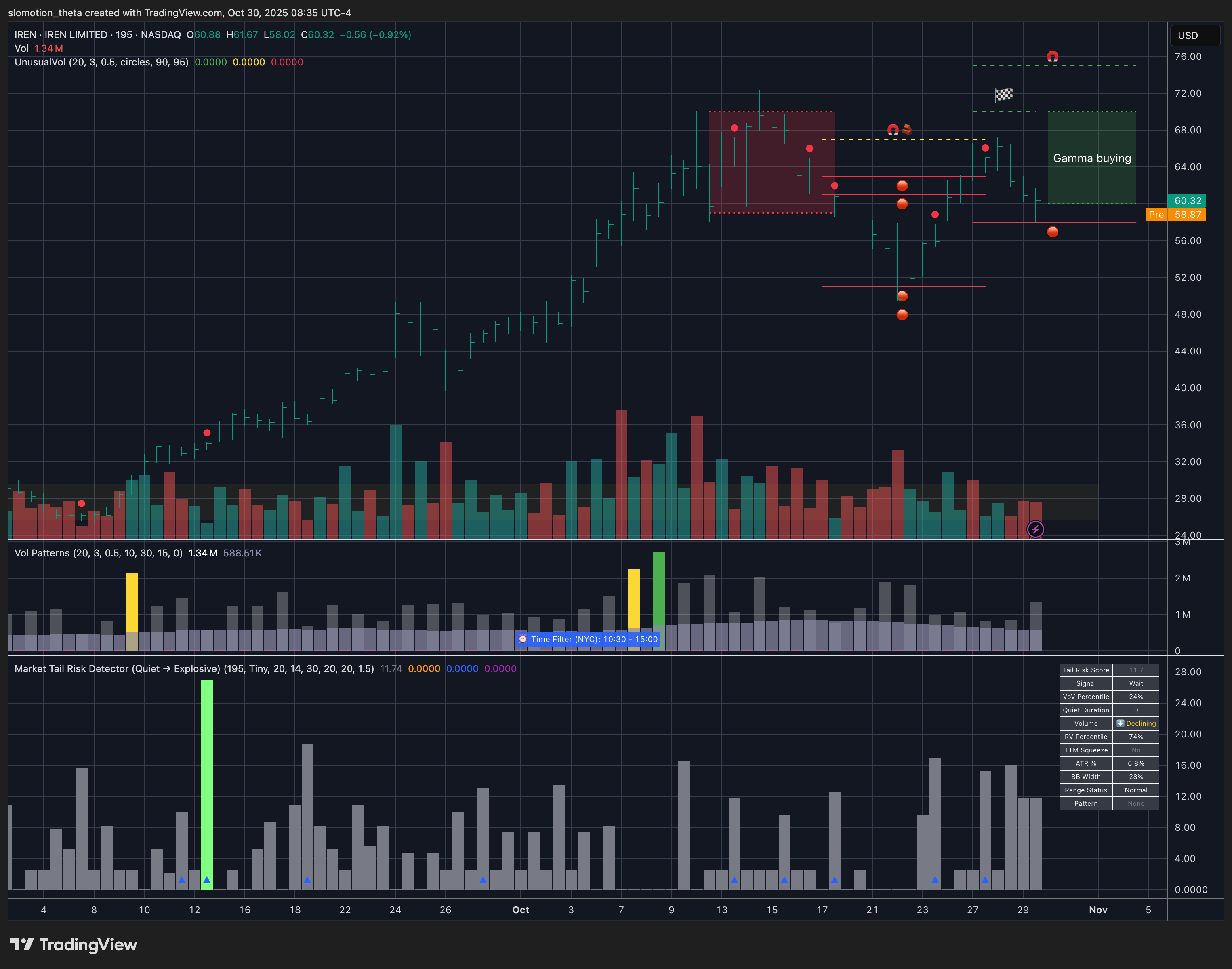 On October 30, IREN hit an intraday low of $57.30 before closing at $58.22. That’s a 12% drawdown in a couple days, but the dealer support at $58 still stood.