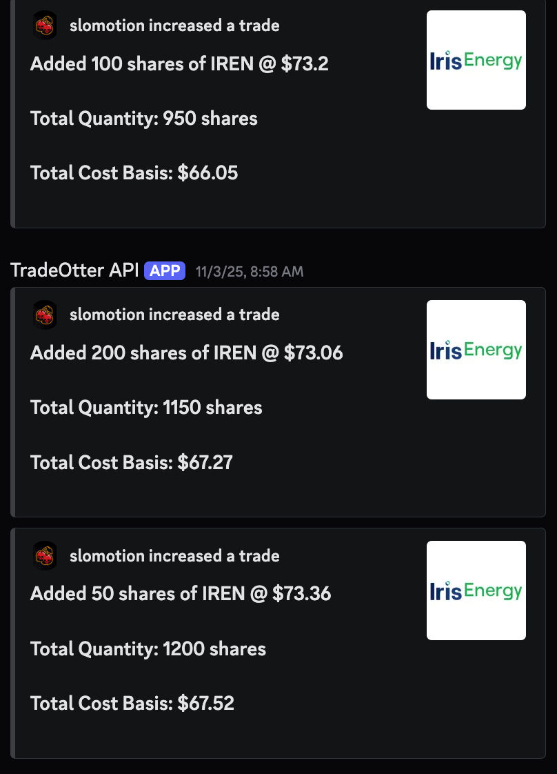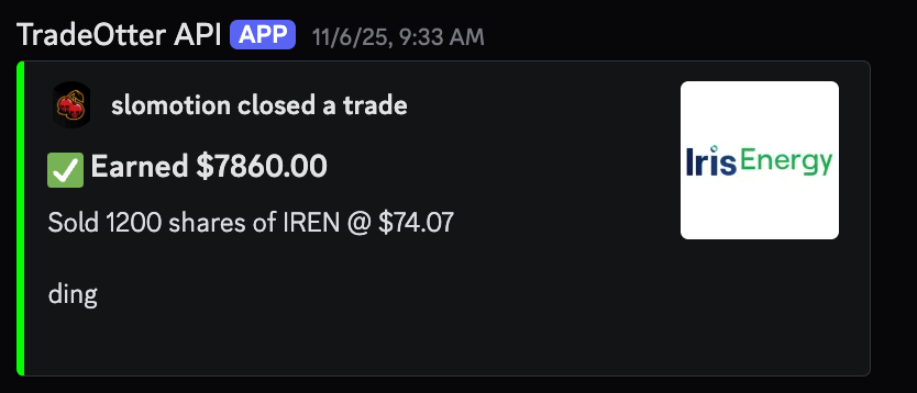 So on market open on November 6th, I sold at $74.07 for a 9.7% gain in 10 days. I was unwilling to risk earnings that evening. IREN continued to slide the same day I sold and closed at $67.19 (a -12.37% drop for the day).